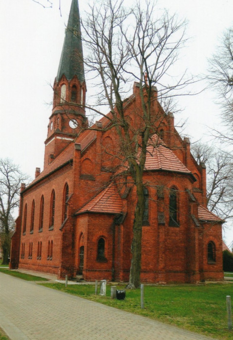 Die 1886 erbaute Saalkirche als typischer Backsteinbau dieser Zeit ersetzte die vorher bestehende baufällige Fachwerkkirche.